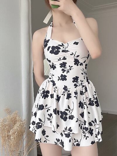 水着 レディース2024新しいワンピース水着女性ブラックフラットコーナー保守的な女の子ストラップネックハイウエスト腹シェーディング水着をぶら下げ