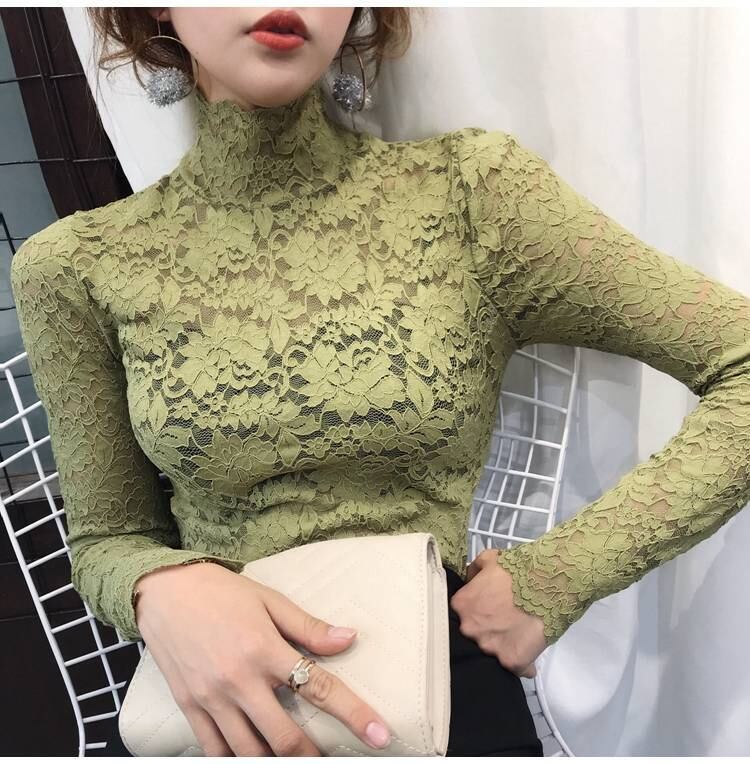 秋冬新作 長袖レースTシャツ レディース ハイネック インナー 無地トップス