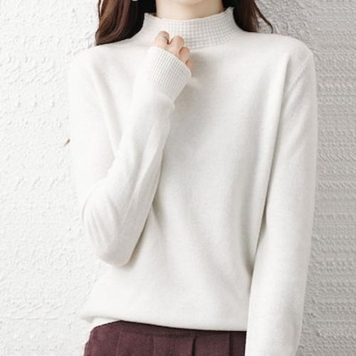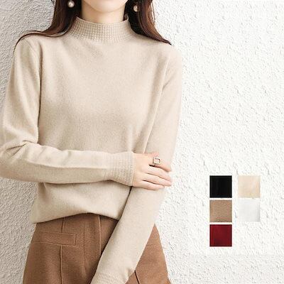 韓国ファッション秋冬人気カシミヤタッチ プチハイネックニットトップス レディース 百掛けトップス ニットインナーVネックベーシックニットゆったりスウェット 長袖 無地リブニット