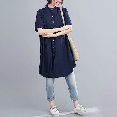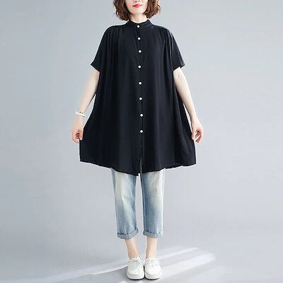 シャツ レディース 半袖 チュニック ロングシャツ 春 夏 秋 ワイシャツ aライン 大きいサイズ ゆったり オーバーサイズ きれいめ フ カジュアル 大人 おしゃれ ゆったり 無地 黒 ブラック