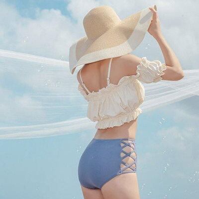 2024 人気 水着 水着 レディース ビキニ ハイウエスト オープンショルダー レースアップ 可愛い 大人 フリル 白 青