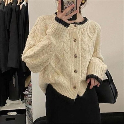 ニットカーディガン レディース 春秋 ニット カーディガン ざっくり編み ショート丈 クルーネック セーター 秋冬 厚手 羽織り 長袖 トップス ケーブル編み 暖かい トップス 柔らかい シンプル 無