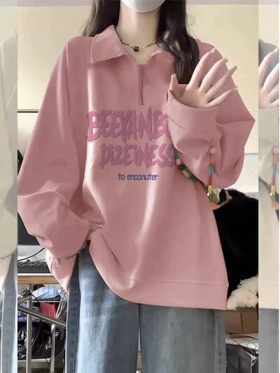 2024 秋冬 2TYPE 厚手裹起毛トップス長袖 かわいいプリントK-POPTロングレディース韓国風衣装カラールーズゆったりカジュアルハーフおしゃれサイズスリーブシルエットファッション系サイドシャツ