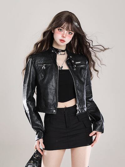 2024秋冬 長袖 ジャケット かわいい ハイネックスタンドネックショート アウター丈羽織り合成バイカラーフェイク黑カジュアル シルエットゆったりファッション系サイズ 色っぽ 女っぽきれいめ大人っぽ
