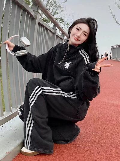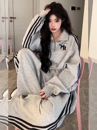 2024 秋冬 2点セット トップス 羽織り ショート丈 セットアップフルパーカートレーナーラウンドヘムルーズ サイド上下ボトムスストレート系冬ゆったりサイズワイドシルエットハーフリラックストラック