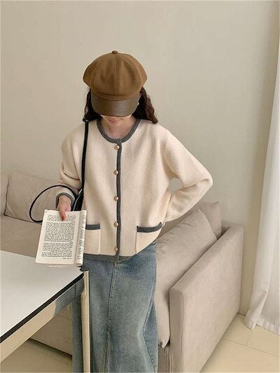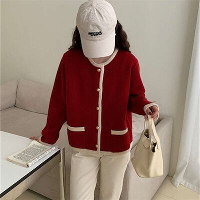 カーディガン レディース 長袖 ニット アウター クルーネック 前開き 春 秋 冬 長袖ニット セーター トップス 配色 羽織り ニットセーター 暖か あったか シンプル きれいめ ポケット 上品 着