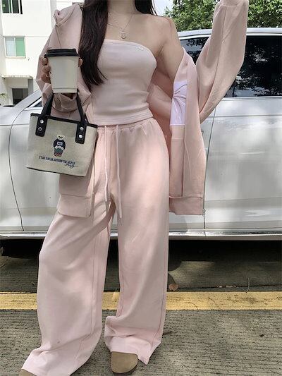 2024 秋冬 韓国 3点セット かわいい レディース フード付きアウター黑白フーディー ブルゾン長袖ショート丈トップスグレー冬カジュアルファッション系お出かけフル丈トラック高校生 通学大学生