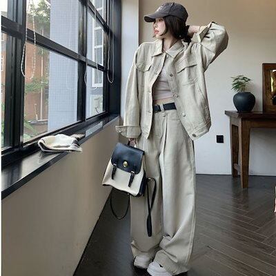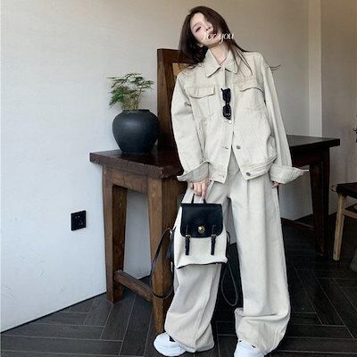 秋冬の新作 カーディガンコートカジュアル ワイドワイドパンツデニム セットアップ けだるさ風 2点セット レディースファッション