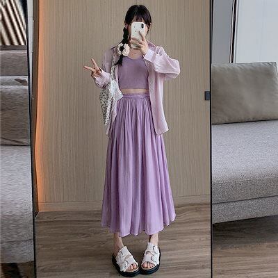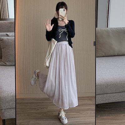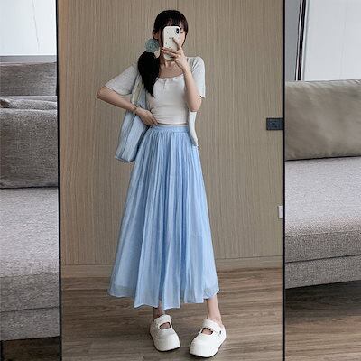 プリーツスカート レディース 無地ストリーミングガーゼスカート 夏ハイウエスト着痩せセミロングスカート