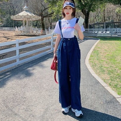 韓国ファッション サロペットレディースデニムストラップパンツ夏 大きいサイズ ストレートジャンプスーツ