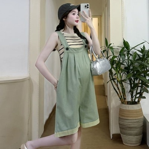韓国ファッションマタニティサマースーツ サロペットレディース 夏デニムバックパンツファッションワイドレッグファイブポイントジャンプスーツ2点セット