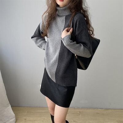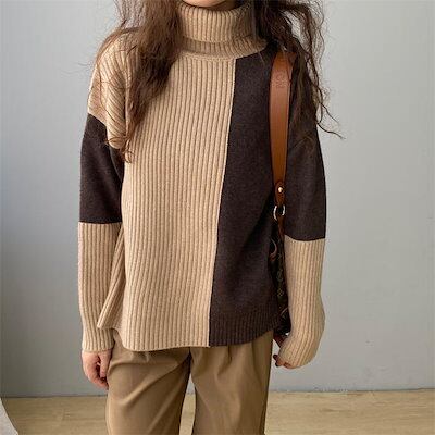 ニット セーター レディース 秋冬 長袖 セーター レディー ス 秋 冬 ニットセーター プルオーバー タートルネック 配色 切り替え アシンメトリー エレガント シンプル 無地 体型カバー 大きいサ