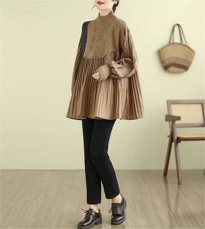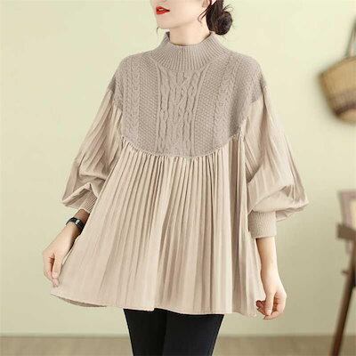 異素材 ドッキング ニット セーター トップス ハイネック レディース 切り替え ブラウス 長袖 プルオーバー プリーツ フレア 大人 パフスリーブ おしゃれ 可愛い ギャザー 秋冬 通勤 体型カバー