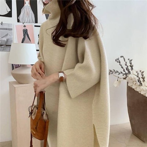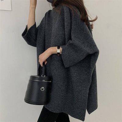 ニットセーターレディース秋冬40トップス長袖ニットソーニットセーター無地スリットハイネックドルマンスリーブポンチョー風韓国風ロング丈ニットトップスゆったりセーター通勤着痩せ4色