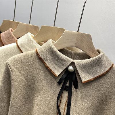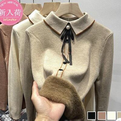 ショットニットセーター レディース 秋冬 40代 長袖 セーター リボン折り襟 ショット 裏起毛 暖かい ゆったり プルオーバー オシャレ 韓国風 ニットインナー
