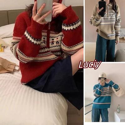 クリスマスセーターレディース新作長袖ハーフジッパーポロネック赤レトロゆったりニットトップス