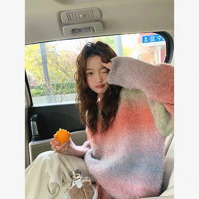 グラデーション レインボー レイジー スタイル カラフル ストライプ ルーズ ジャパニーズ ファーリー トップ ソフト ワックス ジェントル ニット セーター レディース0002