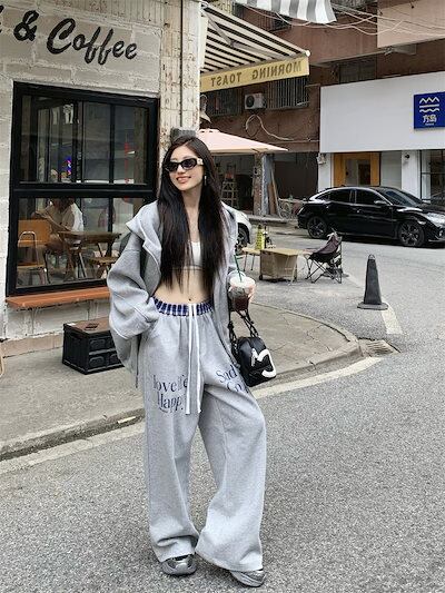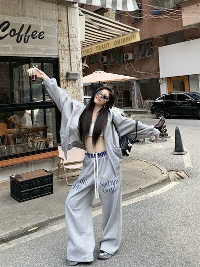 2024 春秋 2点セット トップス お出かけ 羽織り ショート丈 セットアップ フルラウンドヘム ルーズ サイド ボトムス ストレート系冬 ゆったり サイズワイドシルエット リラックストラック