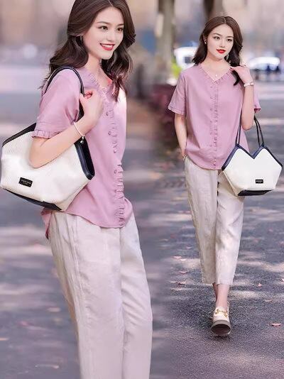 涼しく楽ちんセットアップ 綿麻スーツ新型婦人服2024夏モデル中年ママ半袖九分パンツ セットアップ レディース 夏 韓国 半袖 ルームウェア スウェット上下セット スーツ