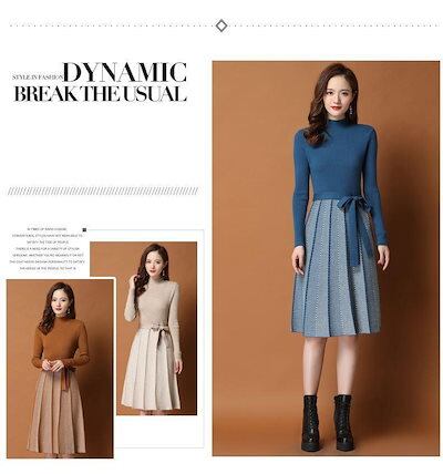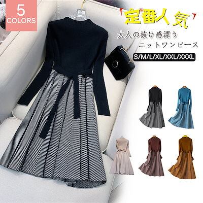 ニットワンピース レディース ベーシックニット 秋冬 きれいめ 膝丈ワンピース 長袖 リボン Aラインプリーツスカート ニット 結婚式ドレス 通勤 ロング 着痩せ オシャレ