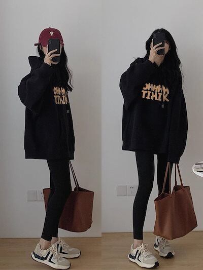 Qoo10限定韓国 パーカー レディース 韓国 ミディアムブラックの連帽韓国 パーカープリントでゆったりカジュアルに 秋アウター ジップ韓国 パーカー 裏起毛