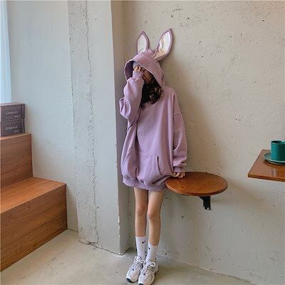 秋 新作SALE!韓国ファッション パーカー レディース 可愛い ウサギの耳 フード付きパーカー カジュアル ゆったり 体型カバー?トップストレーナー キャンパスの学生 長袖スウェット