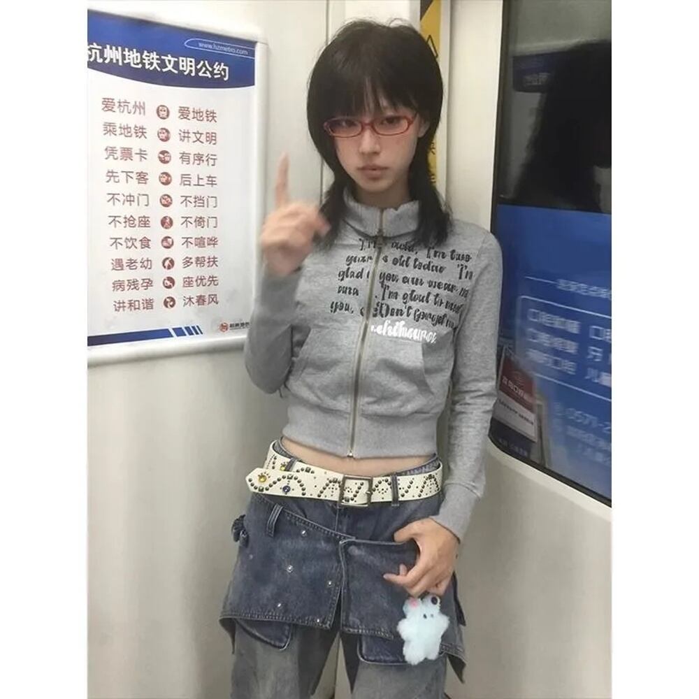 女性のためのヴィンテージアメリカンショートコート,グレーのジッパー付きフード付きスウェットシャツ,長袖,y2k原宿アウター,グランジクロップコート,秋 パーカー ジャージ y2k T240908203810_01