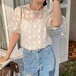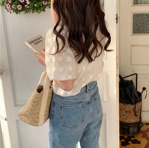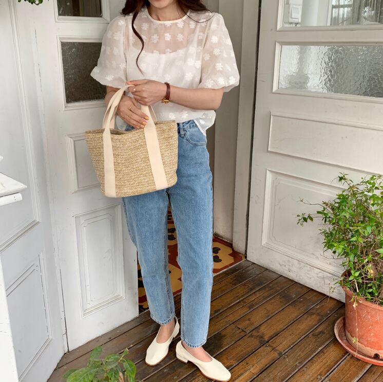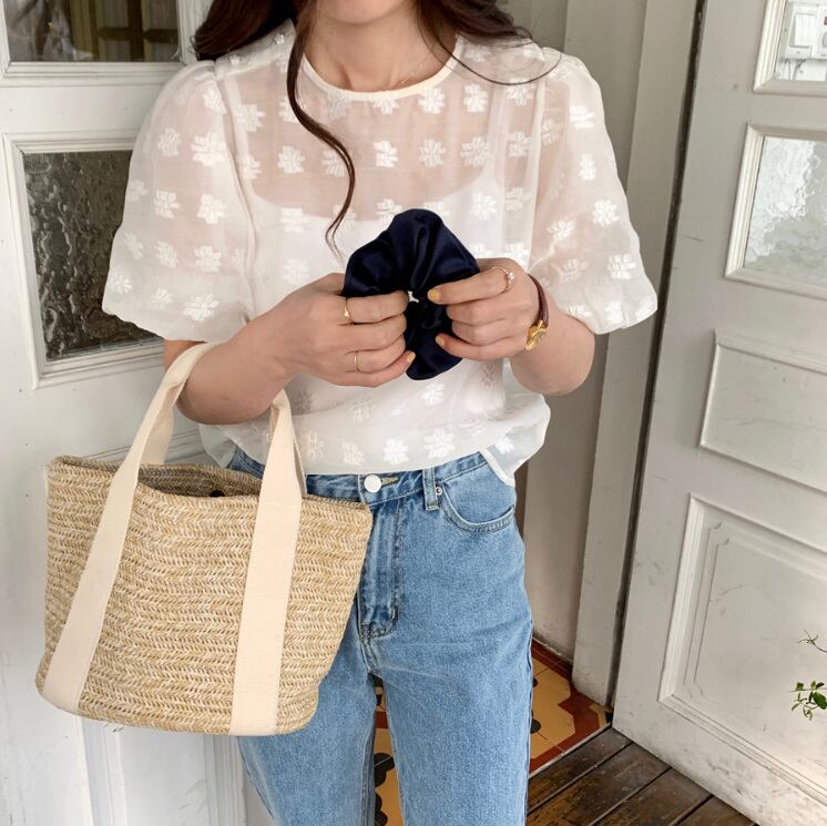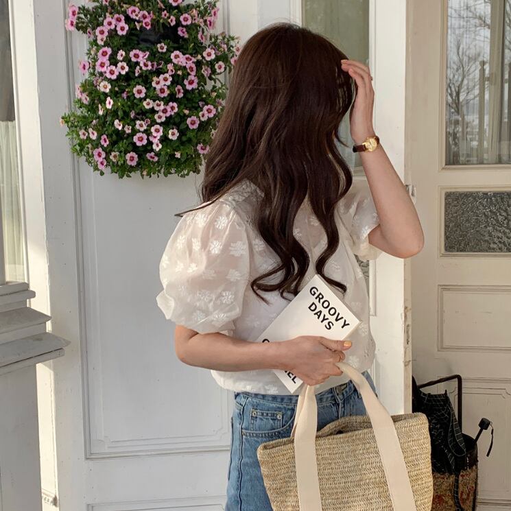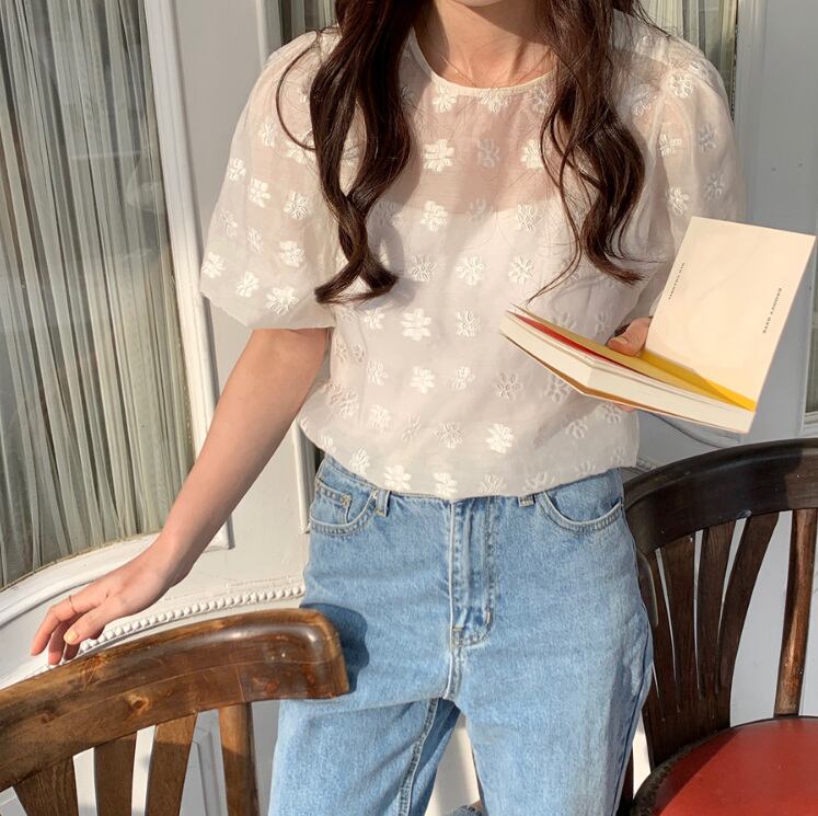 日常に輝きを 夏 ラウンドネック パフスリーブ シャツ 上着 トップス レディース 韓国ファッション