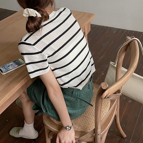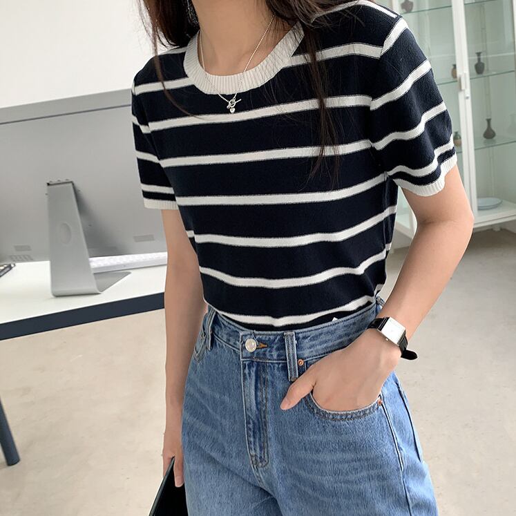 夏 縞模様 プルオーバー 亜麻 半袖 ラウンドネック 上着 トップス レディース 韓国ファッション
