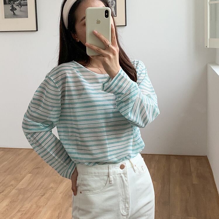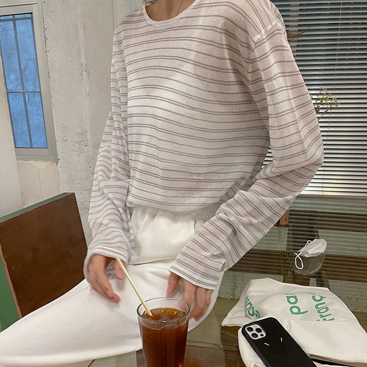 新作 日焼け止め 縞模様 Tシャツ ゆったり シフォン 上着 トップス レディース 韓国ファッション