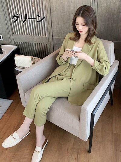3色 セットアップ スーツ フォーマル グリーン ブラック アプリコット パンツ クロップドパンツ スーツ かっこいい レディース 上下セット カジュアル大人可愛い きれいめ シンプル ママ 長袖 ジ