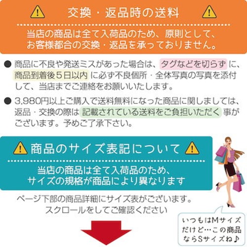 サイズ交換、お色交換などの返品、交換は行っておりませんので十分にお確かめの上、ご購入お願い致します。