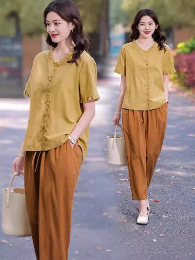 2024 楽ちんセットアップ 綿麻スーツ 婦人服春夏秋モデル中ママ半袖九分パンツ 春夏秋 半袖 ルームウェア スウェット上下セット スーツ レディース