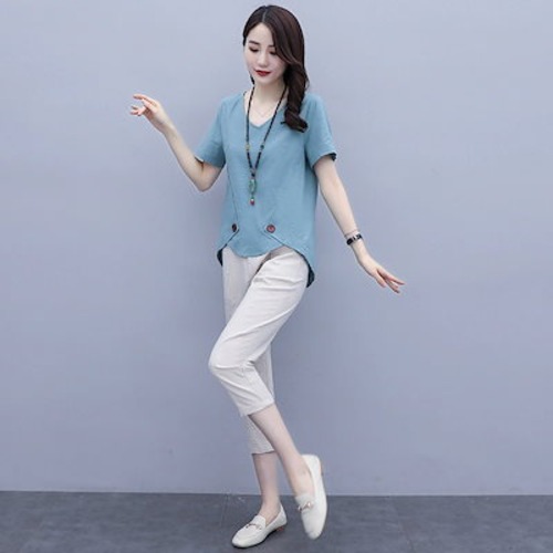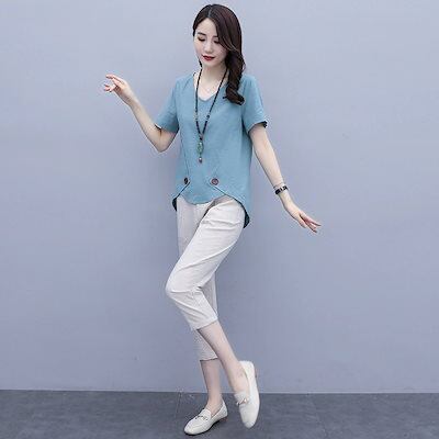 2024 楽ちんセットアップ 春夏秋 半袖 Tシャツ2枚セット綿麻のカジュアルパンツスーツ女性 ルームウェア スウェット上下セット スーツ レディース
