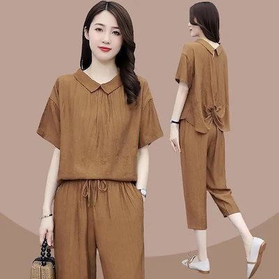 2024 楽ちんセットアップ 春夏秋 サマーサイズカジュアルリネン2点セット 半袖 ルームウェア スウェット上下セット スーツ レディース