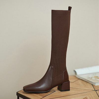 2024 秋冬 お気に入り商品 ニット ロングブーツ レディース ファッション レトロ スクエアトゥ 厚いヒール ロングブーツ 美脚効果 ショートブーツ