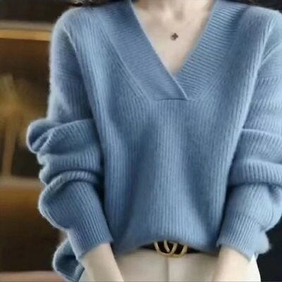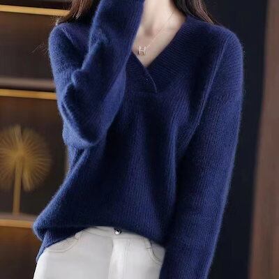 リブニット Vネックジャンパー女性秋冬新作無地シンプルファッションレディースニットトップス