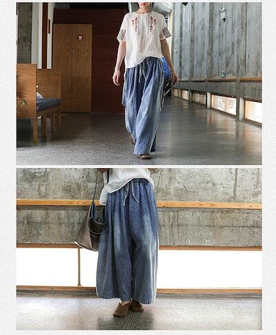 デニムワイドパンツ レディース 大きいサイズ ワイドパンツ ウエストゴム デニムパンツ ウチョパンツ フレアパンツ ボトムス カジュアル 無地 ロングパンツ 大人 楽ちん ゆったり カジュアル お腹