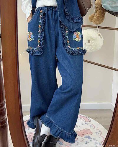 ワイドパンツ デニムパンツ レディース 大きいサイズ 裾フリル ジーンズ ボトムス ズボン パンツ ストレートパンツ 体型カバー 秋冬 九分丈 着痩せ ワイド デニム 花柄 刺繍 ウエストゴム ゆった