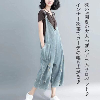 サロペット オールインワン ボトムス レディース ワイドパンツ サロペットパンツ デニムパンツ デニム パンツ ズボン 夏 ロング丈 Vネック オーバーオール デニムサロペット 大人 リラックス 体型