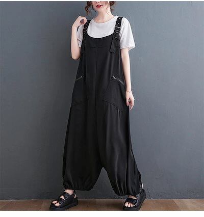 サロペット オールインワン レディース ワイドパンツ サロペットパンツ ロングパンツ オーバーオール ボトムス パンツ ズボン 秋 黒パンツ ロング丈 サロペット 大人 リラックス 体型カバー 着痩せ
