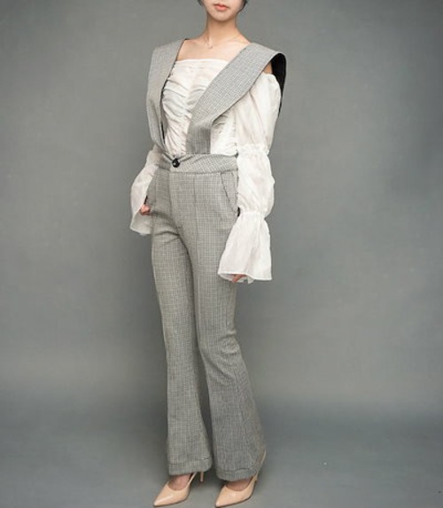 レディース サロペット チェック柄 オールインワン オーバーオール ボトムス きれいめ カジュアル 可愛い フェミニン おしゃれ お出かけ デイリー グレー 灰色 XS S M L サイズ