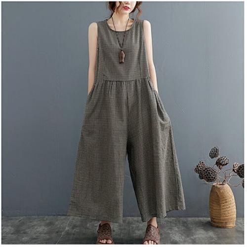 サロペット パンツ レディース オーバーオール つなぎ 袖無し チェック柄 ロング丈 ズボン ワイド パンツ きれいめ 着痩せ ゆったり 体型カバー シンプル かわいい おしゃれ カジュアル コーデ