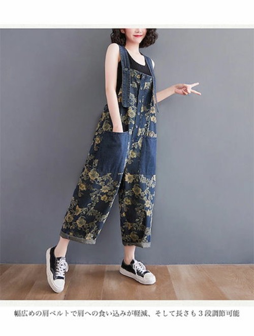花柄 デニムサロペット レディース オーバーオール 夏 ゆったり サロペットパンツ 体型カバー オールインワン レトロ デニムオーバーオール 大きいポケット ワイドパンツ デニム ジーパン ジーンズ