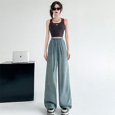 ワイドパンツ 接触冷感 夏 デニムパンツ レディース ひんやり パンツ 爽やか デニムワイドパンツ 涼しい ジーンズ ロング丈 ボトムス 冷感素材 リラックス ウエストゴム ジーパン バギーパンツ イ