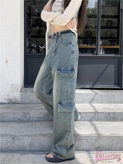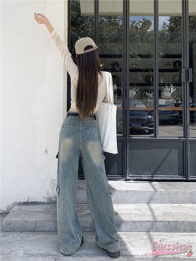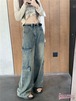 2024 春夏パンツ モップパンツ デニム ジーンズ ワイド ストレート ポケット ハイウエスト 脚長効果 美脚効果 細見え ウォッシュ加工 春 水色 カジュアル 韓国ファッション レディース お出か