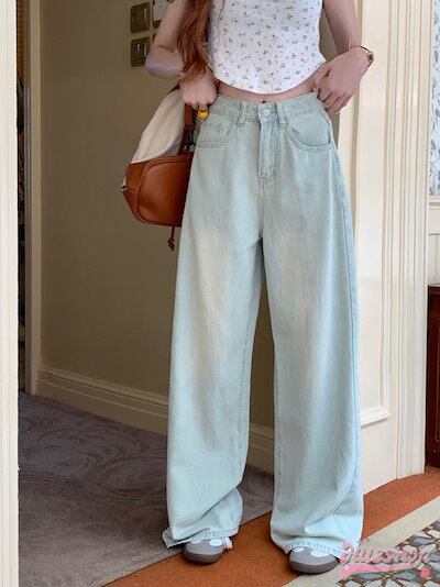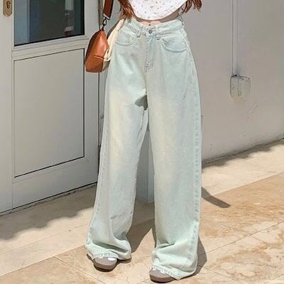 2024春夏パンツ モップパンツ デニム ジーンズ ワイド ストレート ハイウエスト 脚長効果 美脚効果 細見え ウォッシュ加工 春 水色 カジュアル 韓国ファッション レディース お出かけ