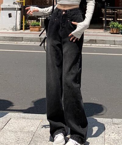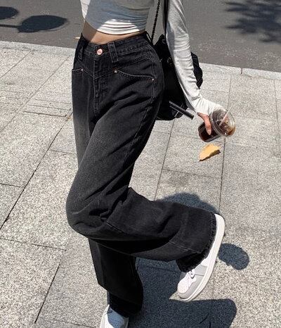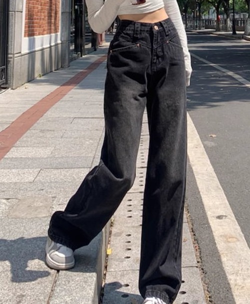 2024春夏 アメリカン パンツ デニム ブラック ジーンズ ロング丈 スキニー レッグ加工 ハイウエスト 脚長効果 美脚効果 細見え 秋 カジュアル 韓国ファッション お出かけ1
