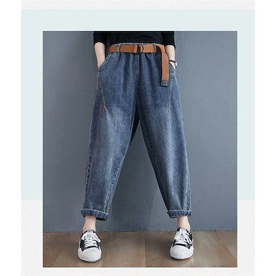 デニムテーパードパンツ レディース 九分丈 ボトムス ウエストゴム ベルト付き 美脚パンツ 無地 大