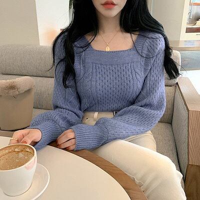 ニットセーターレディース秋ニットソー長袖スクエアネックセータートップスショット丈ニットセーターゆったりニット韓国風大人可愛い着痩せ